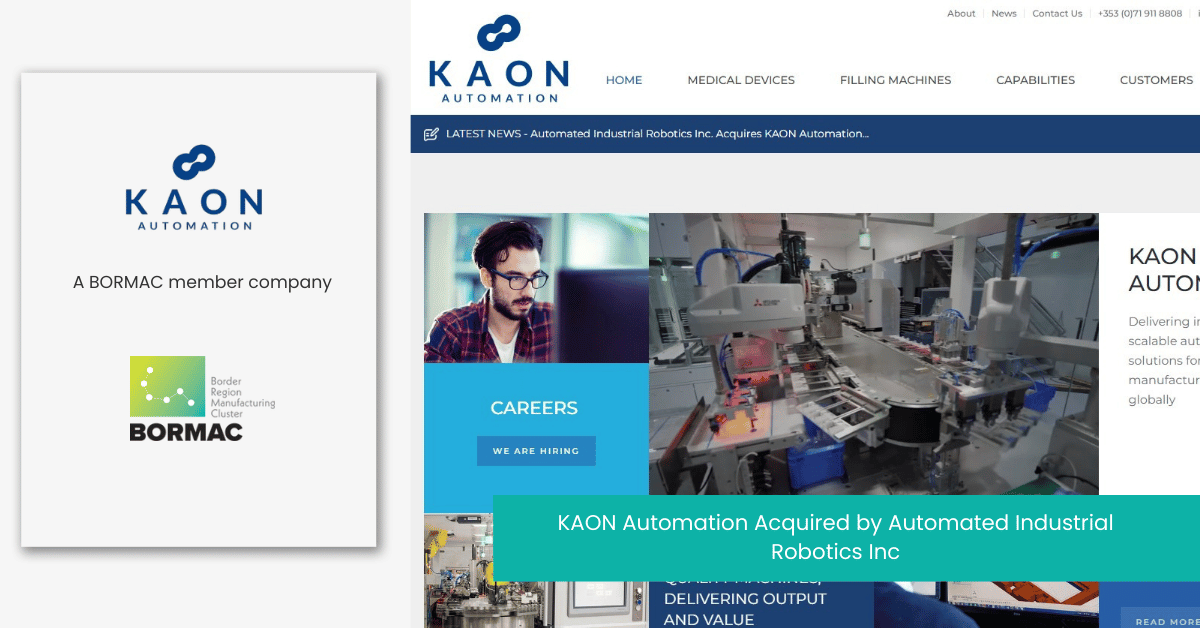 Automated Industrial Robotics Inc. (AIR) has announced the acquisition of BORMAC Cluster member KAON Automation. Kaon Automation is a Sligo-based specialist in advanced industrial automation. The move significantly strengthens AIR’s footprint in the life sciences sector, leveraging KAON Automation’s expertise in precision assembly, high-speed aseptic filling, and modular system architectures. KAON Automation brings specialised knowledge …